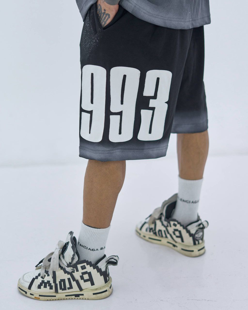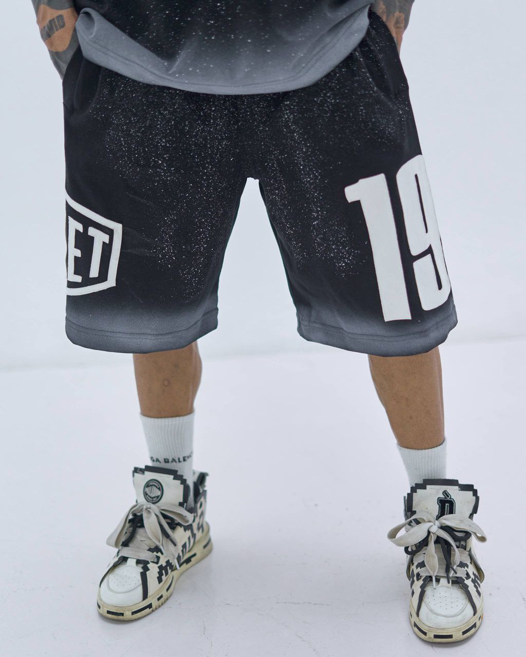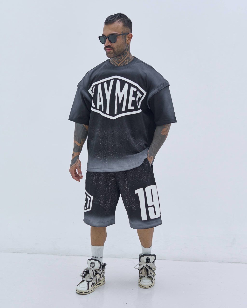 ترکیب رنگ مشکی طیفدار (گرادینت به طوسی) با افکت پاششی مدرن و چاپ سفید درشت PAYMET روی سینه، جلوهای کاملاً استریت و امروزی ایجاد کرده. عدد 19 روی شلوارک هم حس اسپرت و ورزشی کار رو کامل میکنه.