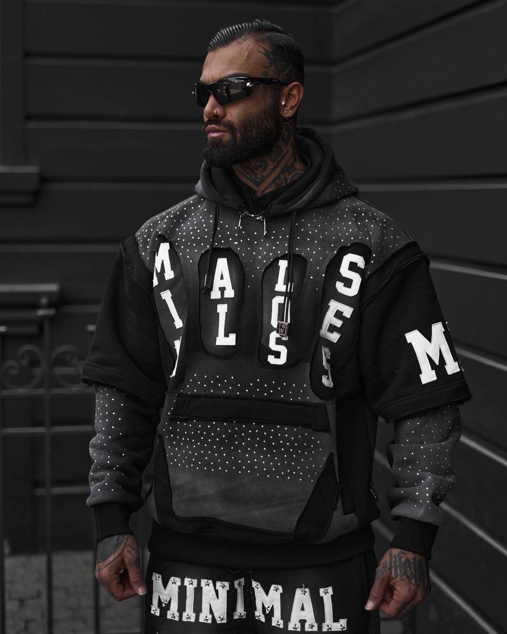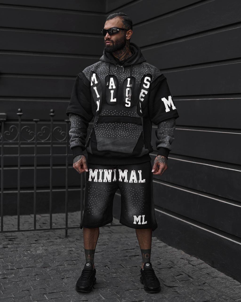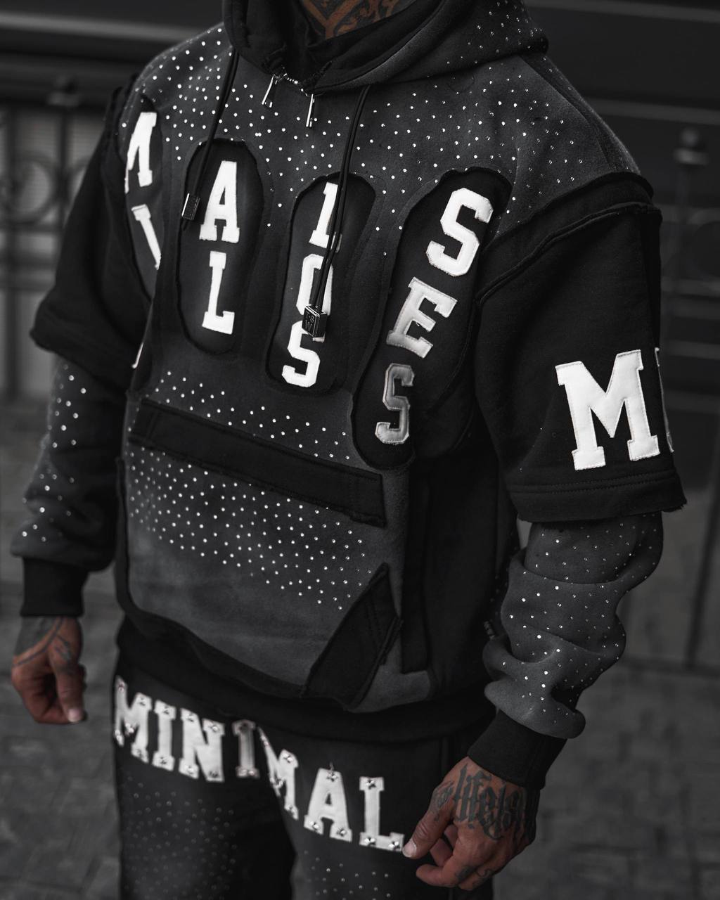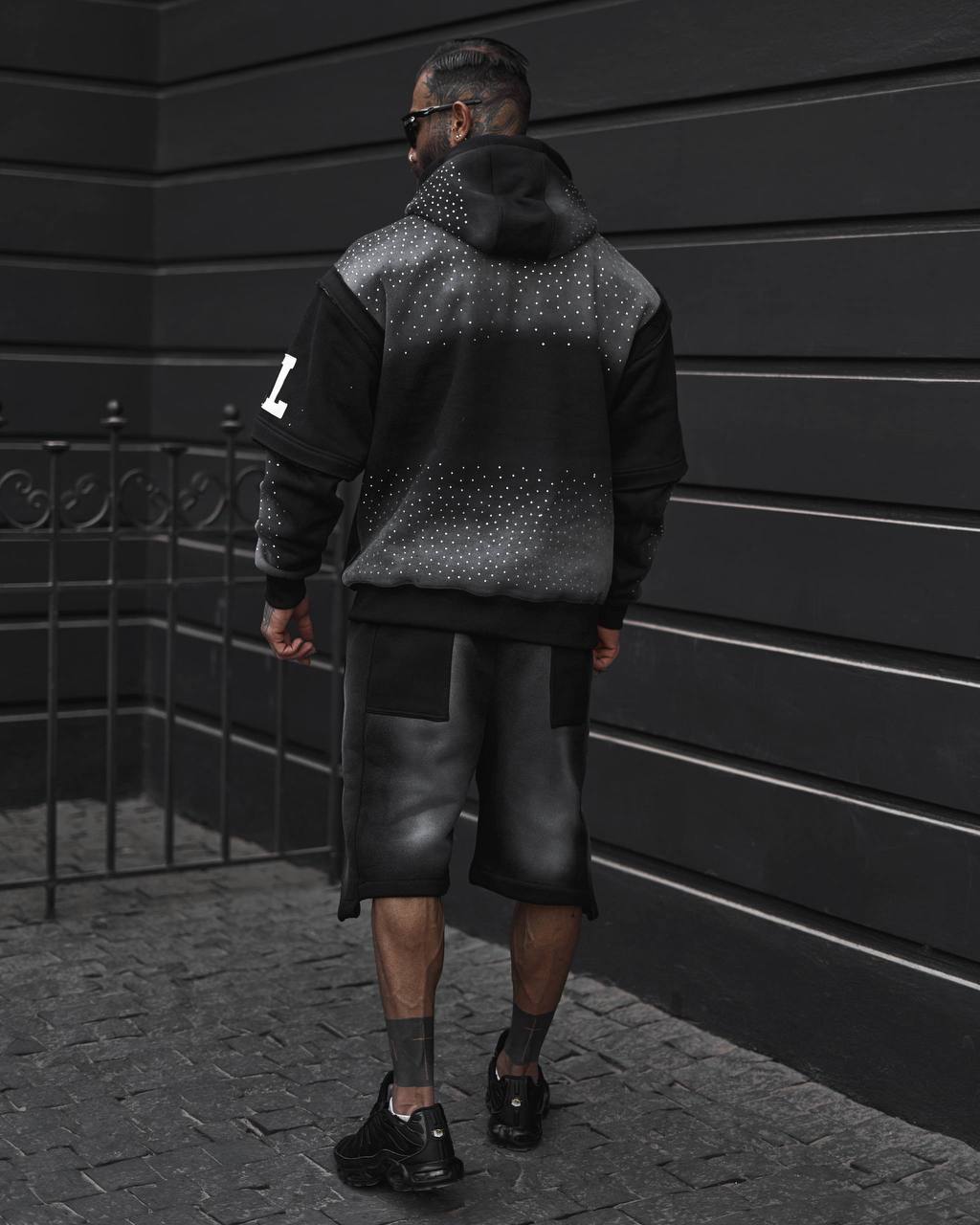 افکت اسپری مشکی روی هودی و شلوارک، همراه با چاپهای برجسته و نگینهای نقرهای، این ست را به یک آیتم فوقالعاده لوکس در سبک Urban تبدیل کرده.