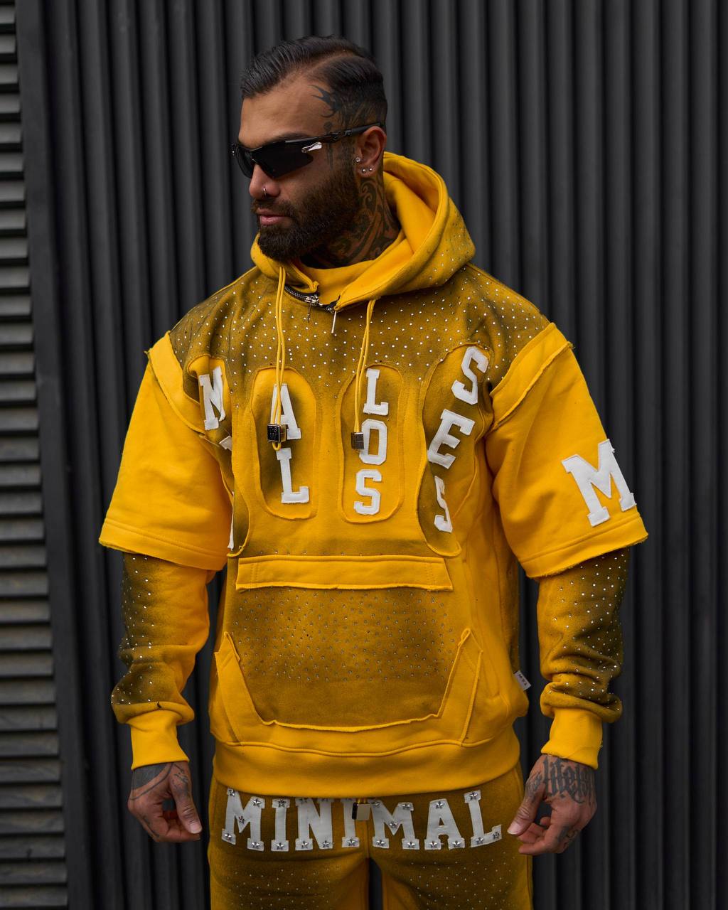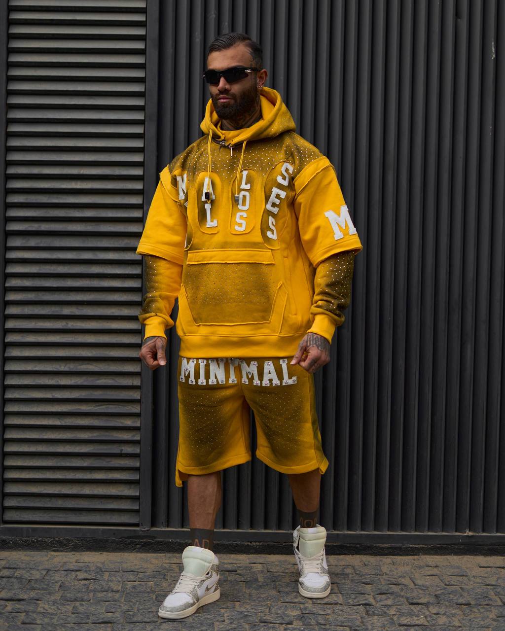- طراحی: چاپهای گرافیتی، نوشتههای HEAVEN / STUDIOS / MINIMAL و عدد ۹۹ روی جلوی تیشرت، پشت و آستینها + روی شلوارک
